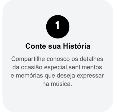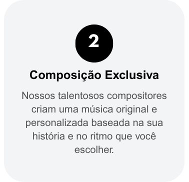 Você nos conta a história, transparece os sentimentos e informações sobre a pessoa homenageada. Com base nisso, nossos compositores criam uma letra única, feita especialmente para você. Em seguida, gravamos a música com qualidade profissional e entregamos o material finalizado.