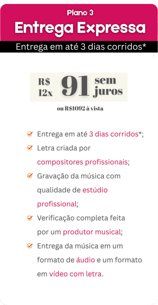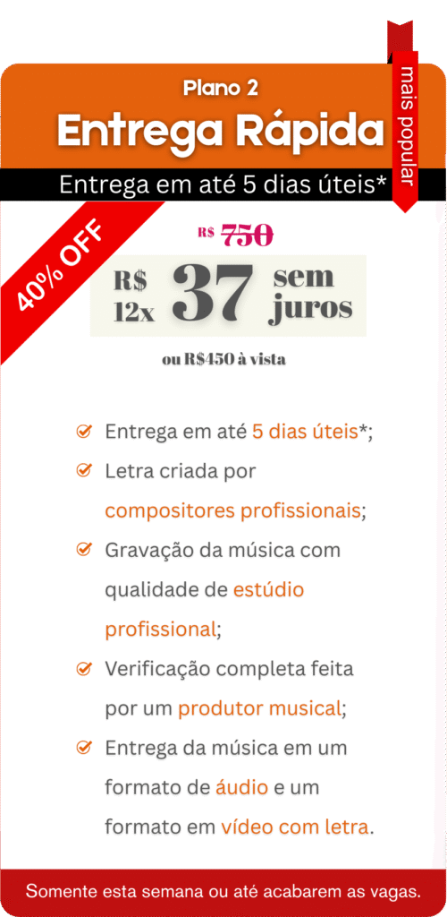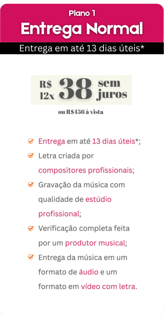 Você receberá a música em formato MP3 (alta qualidade) no seu e-mail e/ou WhatsApp. Se contratou vídeo, enviaremos o link para download em HD.